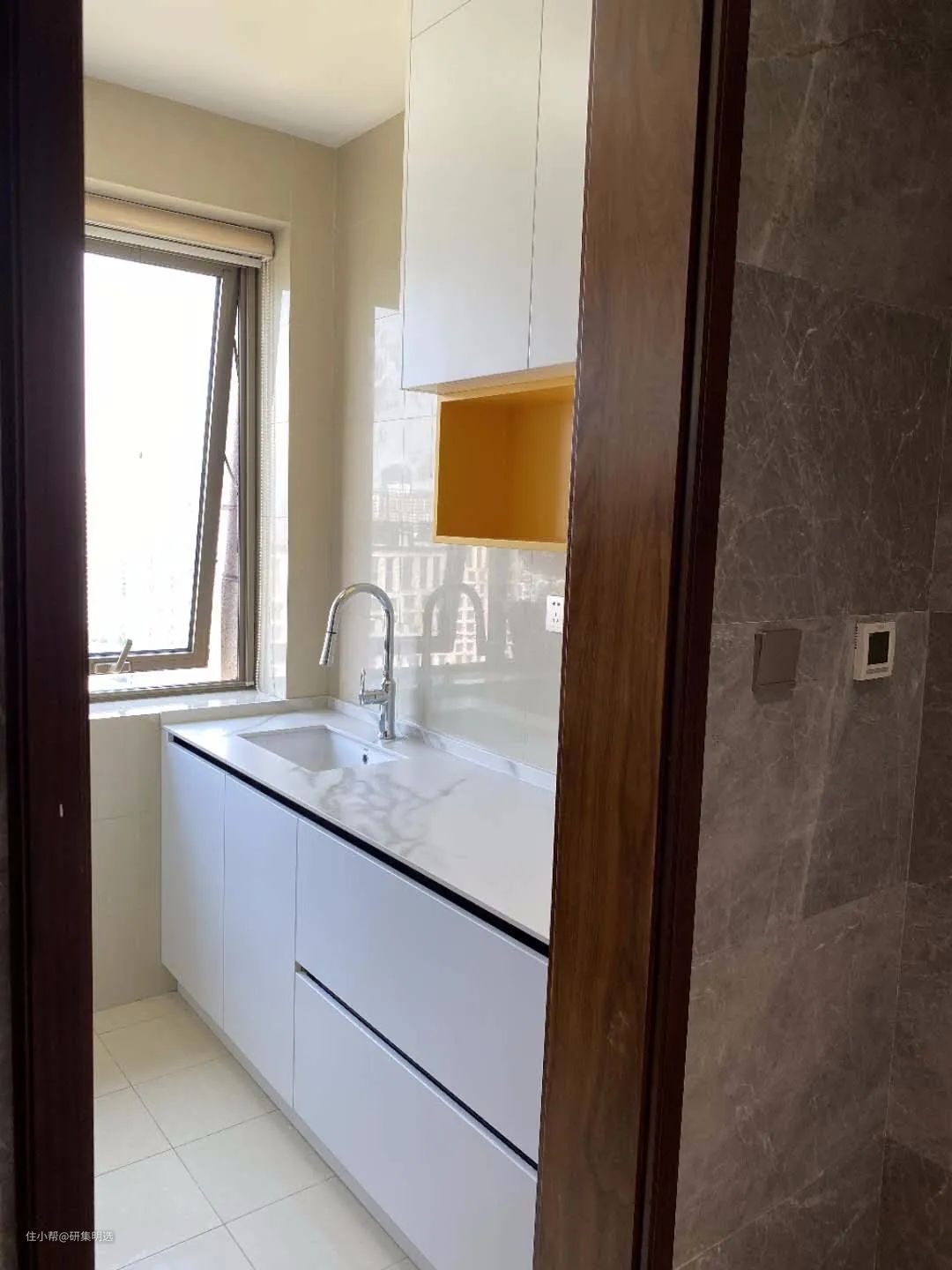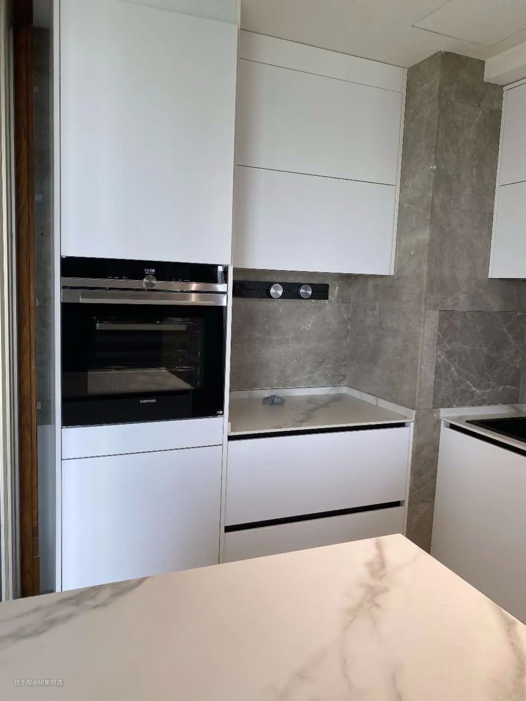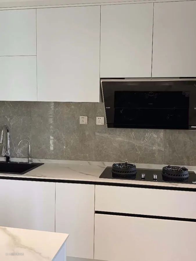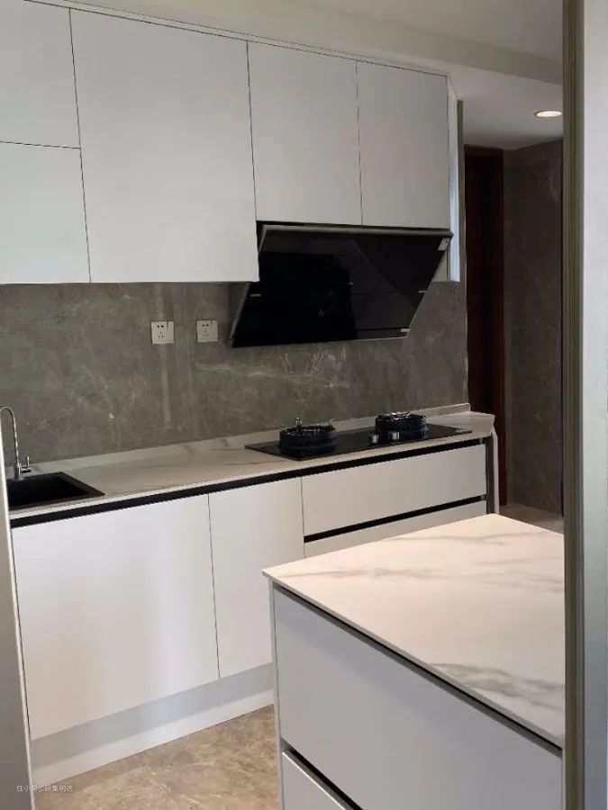我朋友家用的是哑光无缝亚克力面板做柜子,台面选择鱼肚白岩板,做完后,评价也很不错。