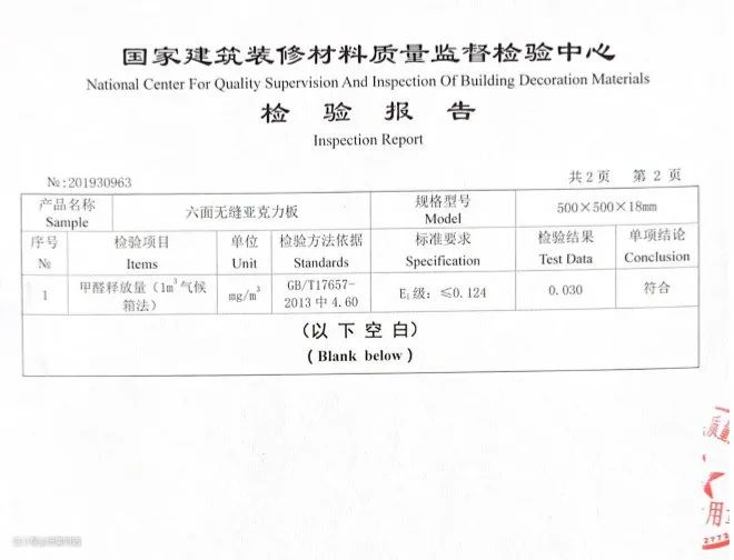 上图为六面无缝亚克力板的质检报告,可以看出,检验结果为0.030,远低于国标E1级标准要求。
