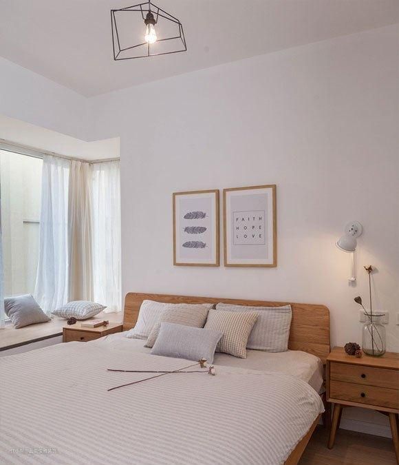不需要很上档次的装修材料,也不要使用过于艳丽的配色设计,白色为主的空间,利用原木色来点缀,通透而干净的睡眠环境看起都感觉很舒服,也能让你可以更快地进入睡眠状态。