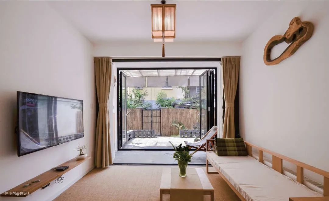 客厅是整座房子的中心,向南连着院子,向北连着内室,原来的小门,换成四扇通高折叠玻璃。