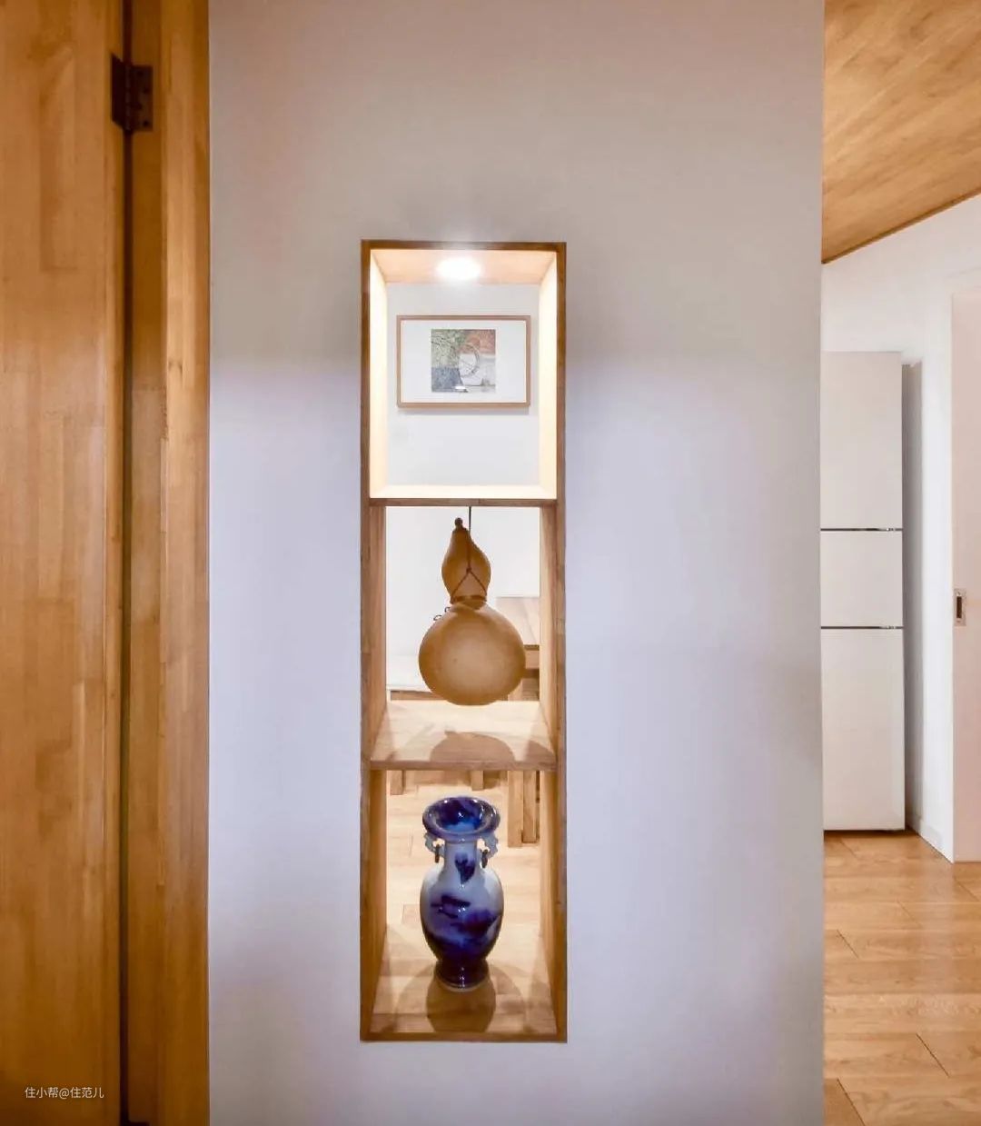 客厅原本有一根壁柱凸出来,所以设计师索性用石膏板沿壁柱的厚度,包出来一个窄窄的展示柜,出现一个中空的双层墙,双层墙的窗口正对侧院里的竹子。