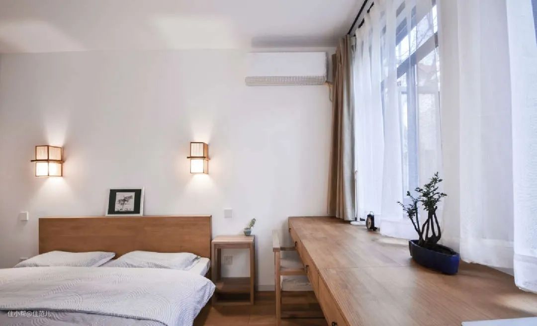 主卧的窗景正对着院子里的腊梅,窗前的悬挑大桌,长度达3.3m,用木方固定在墙上,通过一排有厚度的大抽屉防止大桌板产生形变。