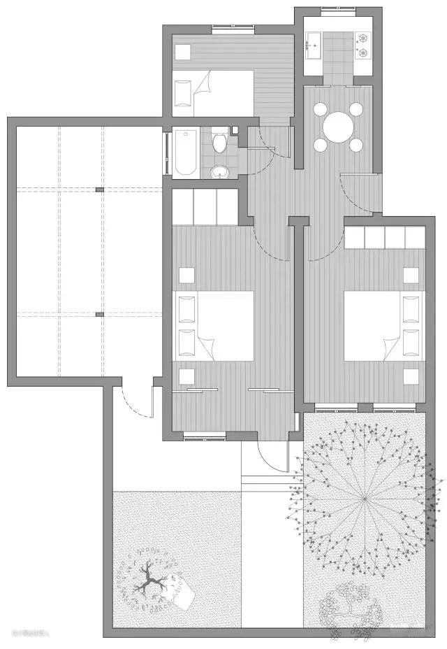 一个简单的空间明暗游戏,给了内室应有的私密,让客厅和院子联结了一起。