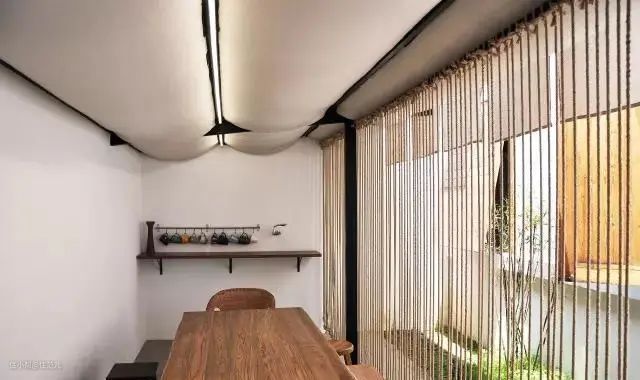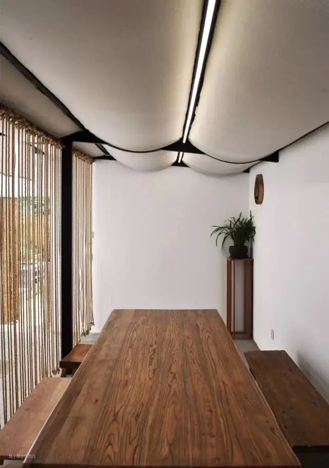 顶棚麻布帘根据钢结构的走向,形成了一折一折的波浪,营造出满满的围合感。