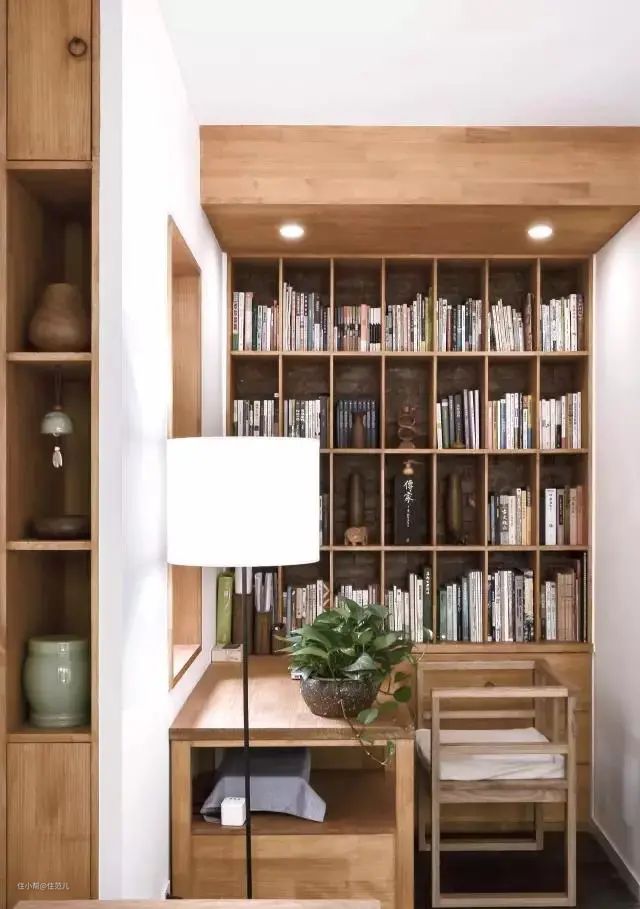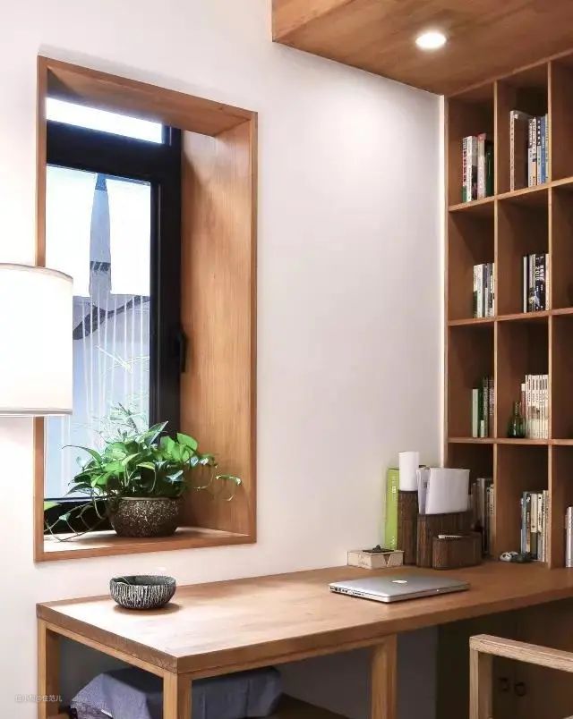 客厅原本储物柜的一个内凹空间,被设计师做成一个迷你书房,一抬头正对侧院窗景。