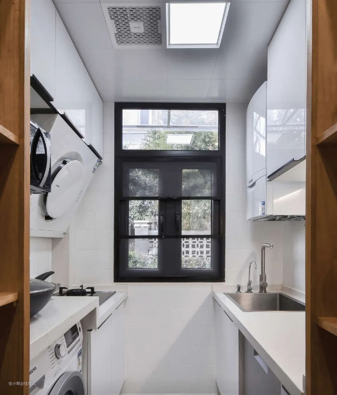 厨房很小,只有4㎡,侧墙、吊顶、地面、甚至家电都选择了抽象的白色,极大拓展空间的视觉感。