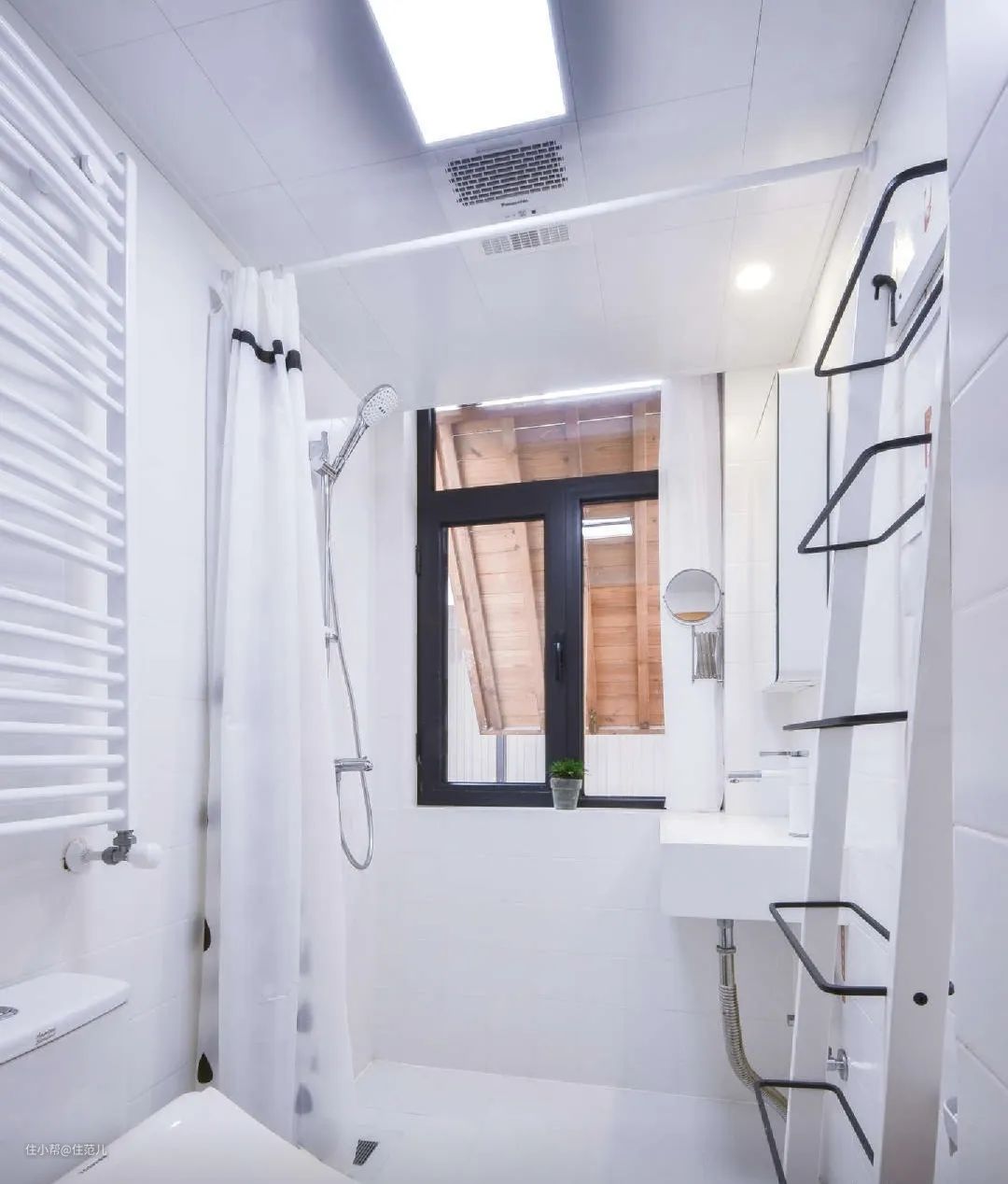 只有2㎡多的卫生间,淋浴区取消了惯常的高低落差做法,通过坡度同样保证排水顺畅。