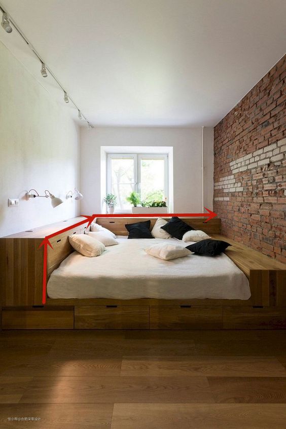 然后靠墙部分再做些细微的改变,实用性又翻一番,柜子做高包围床垫,她家上面全是抽屉柜,不仅增加了卧室的收纳量,还能当床靠背,同时也取代了床头柜的作用,让这个小小空间获得了最佳利用。