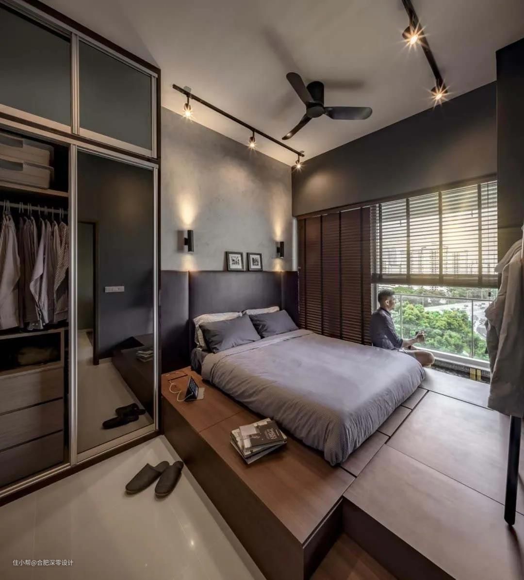 顺应床铺的位置,把侧面换成衣柜或增设衣帽间,空间的实用性不减,生活照样舒心愉快。他家衣柜是"架"在地台上的▼