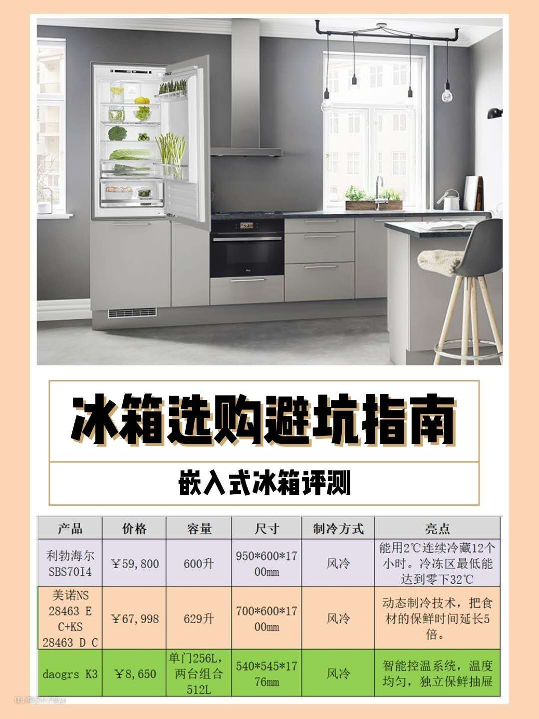 评测总结:比对总结请见图,详细分析对比了,同样是国外进口,三款嵌入式冰箱的价格差别挺大的,对制冷要求高可以考虑利勃海尔。但从性价比来说,可以选择daogrs k3更合适哦,各方面数据表现都不错,价格更容易接受。