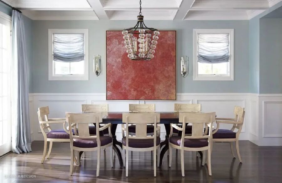 这个走廊拥有经典的传统元素,例如精美的镀金镜和橡木控制台,天蓝色的草布墙纸和西梅色的打褶姜缸台灯形成了有趣的对比。漂亮的紫色丁香花也是不错的点缀。