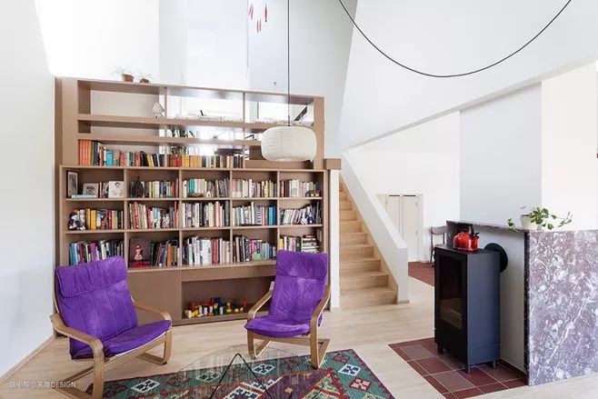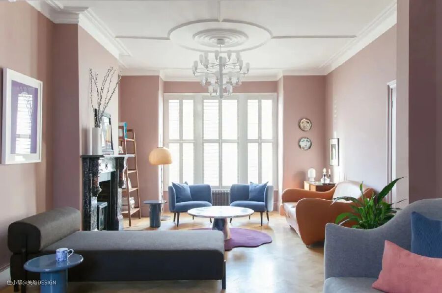 在这间客厅里,一张波浪形的虹膜区域地毯被一幅相应的带有红色流行色的装饰画进一步强化了。柔和的灰玫瑰色墙壁在不破坏空间整体甜美感的情况下,营造出精致的背
