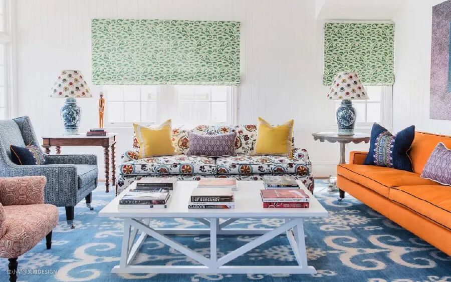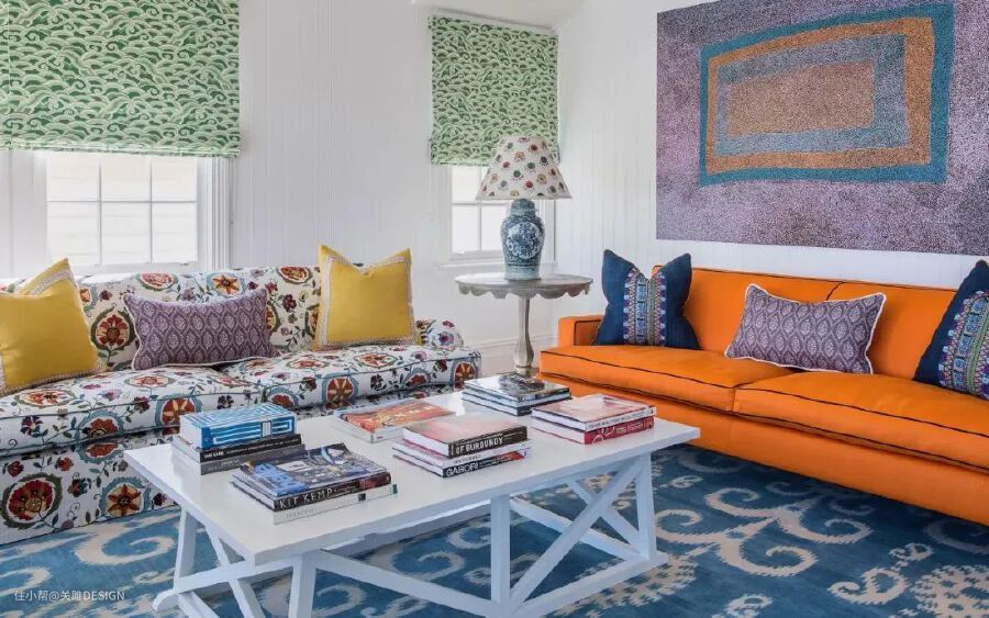 对立吸引是色彩理论的经典法则之一,这间古怪的、满是图案的客厅就是证据。充满活力的橙色沙发让柔和的淡紫色变得温暖,营造出完美的视觉平衡。
