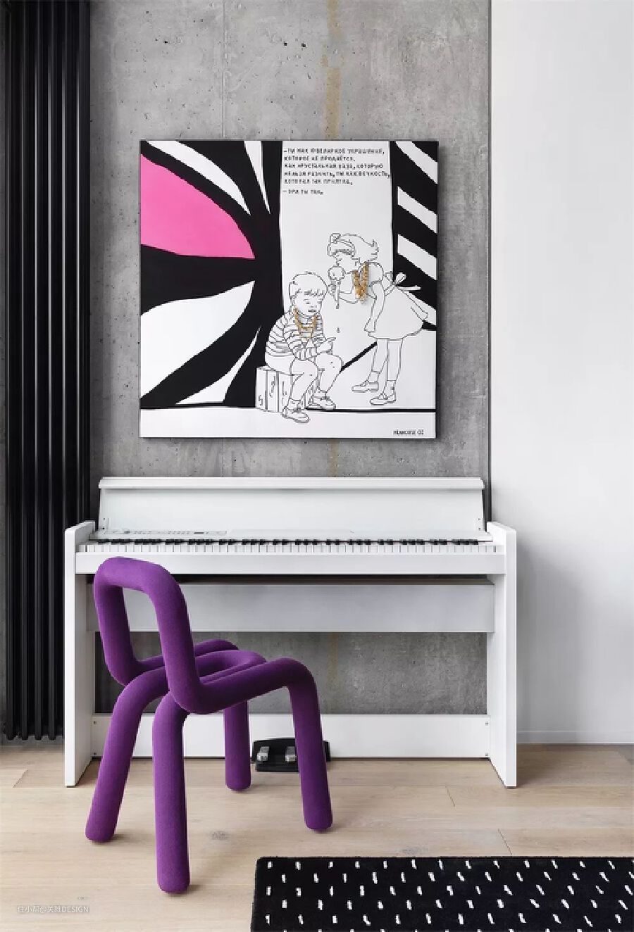 素雅的浅灰色结合饱满浓郁的女王紫,可以获得高贵华丽的视觉感受,在丰富的层次渲染之中,奢雅的令人“爱不释手”。这套案例便是如此。浅雅的雾色墙面与白色天花板,在明亮的光线下打造出轻盈柔婉的空间基调,烟灰色窗帘与云灰色地毯为其赋予一定的暖色温度,强化氛围与视感,增加灰色质感。银色多人沙发与帝王紫单人沙发组成的谈话组惊艳惹眼,高贵范的强强联手打造出华美的视感,紫色的靠包点缀将质感强化,凝练出优美的气质姿态。