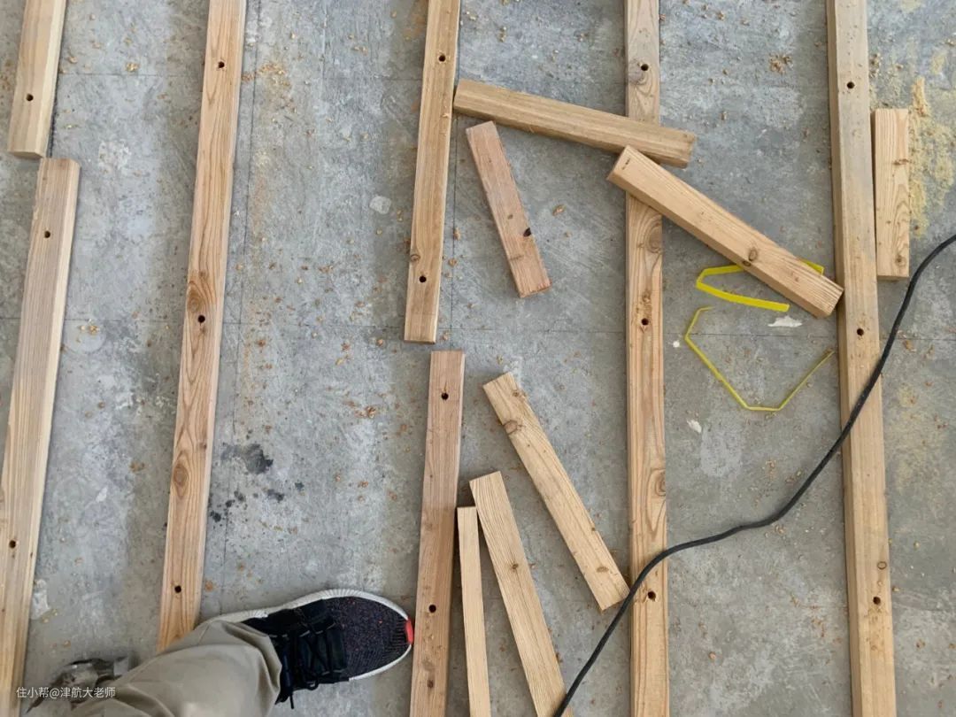2、选择合适的龙骨尺寸(我家是25mm高×45mm宽)。这里,建议泥工在预留地砖水平时,高度60mm差不多。60mm=25mm龙骨+18mm地板+1~2mm防潮膜,差不多预留15mm机动调整。