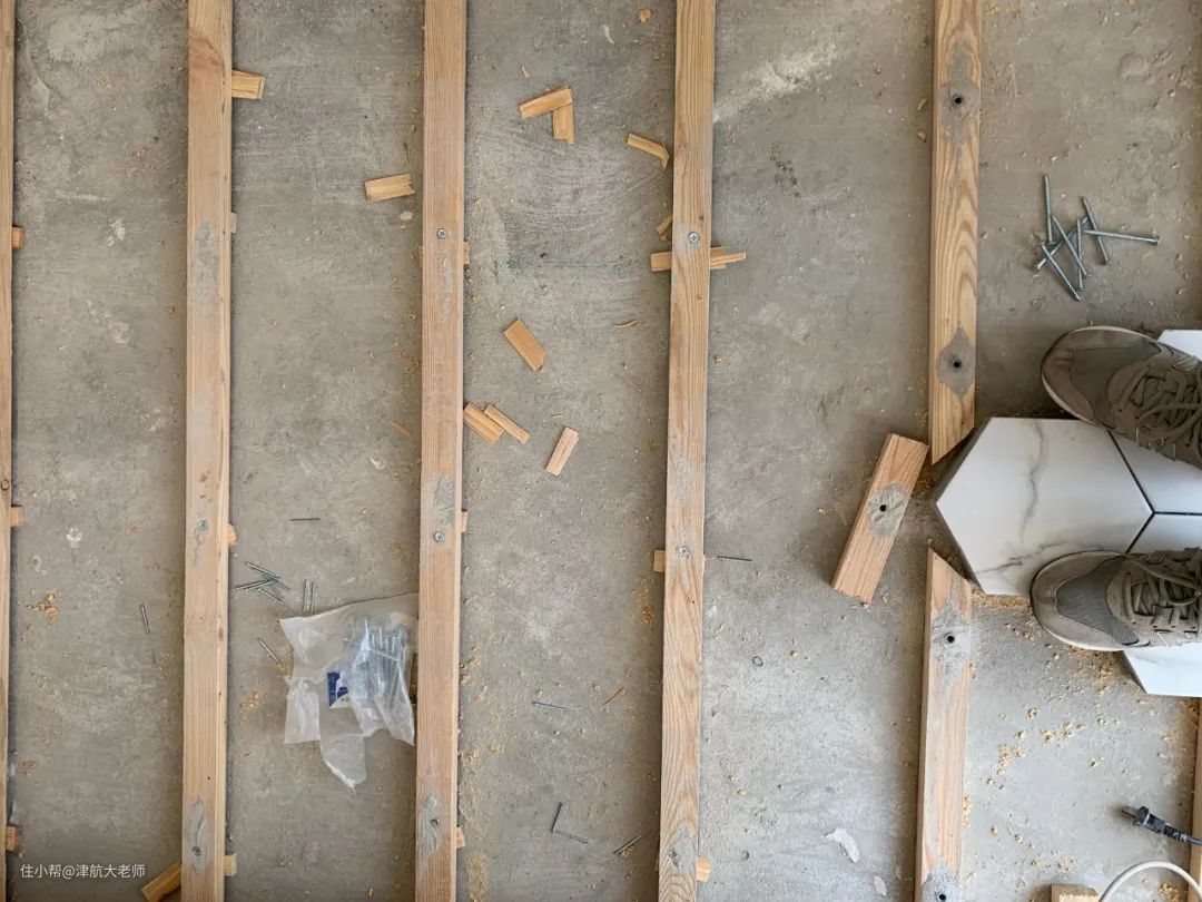 之前在网络上搜相关帖子,基本都是悬浮铺设强化地板去拼接六角砖,所以我再具体展开讲一讲龙骨铺贴实木地板,拼接六角砖的一些注意事项。