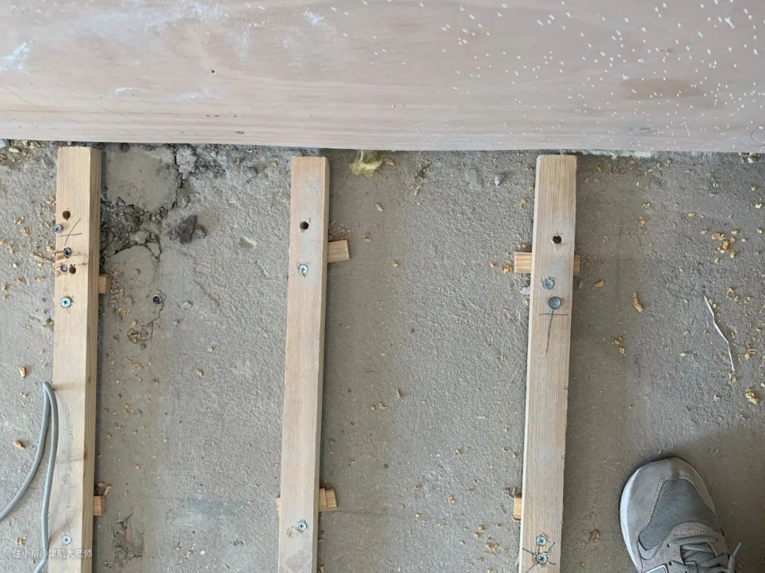 3、龙骨的间距。(我家910cm的实木地板,会架在4根龙骨上)龙骨间距根据地板长度进行调整,比如我家910cm地板,为了保证踩上去受力均匀,龙骨间距30.3cm,这样保证每块地板会架在4根龙骨上。