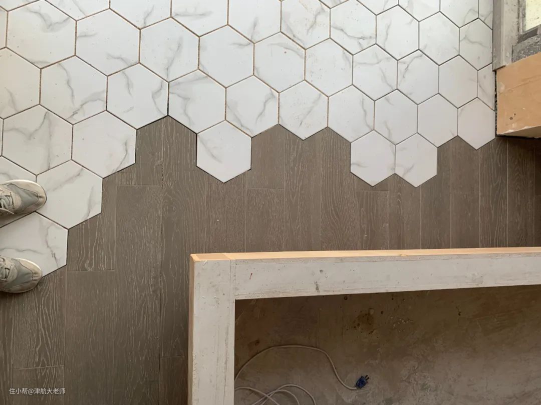 2、我家有六角砖碰地板的需求,师傅看了比较淡定(看来做的人还挺多),不是很好做,单独加了几百元工钱。