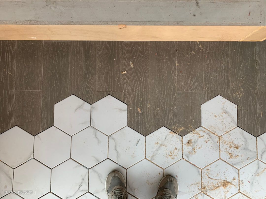 2、我家有六角砖碰地板的需求,师傅看了比较淡定(看来做的人还挺多),不是很好做,单独加了几百元工钱。之前在网络上搜相关帖子,基本都是悬浮铺设强化地板去拼接六角砖,所以我再具体展开讲一讲龙骨铺贴实木地板,拼接六角砖的一些注意事项。