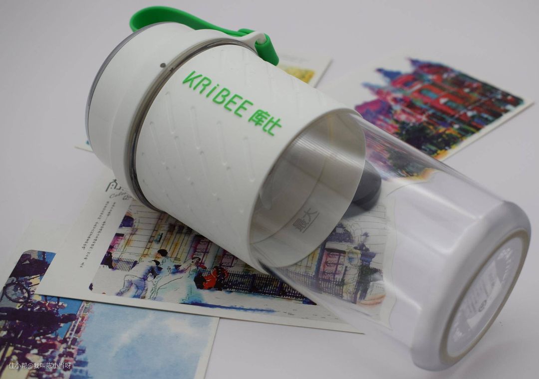 杯体上有一圈白色的硅胶杯套,既能防滑,又能隔热,斜的凹印增加防滑摩擦。硅胶套上印着绿色的库比中英文logo,增添一丝俏皮,让小巧的榨汁杯更加可爱,更适合适合女性和儿童使用。