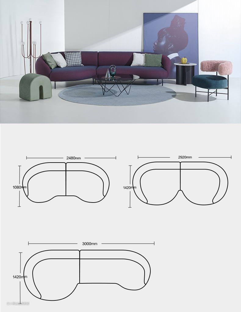 这款沙发的颜色非常特别,看似是紫色,但会随着光影变化出蓝色的光泽,具有女王气场;造型生动灵活,通体以婉转圆润的弧线勾勒,扶手与靠背一体化式设计,坐感舒适。这款沙发的尺寸最小可以做到2480mm*1080mm,对小户型非常友好。