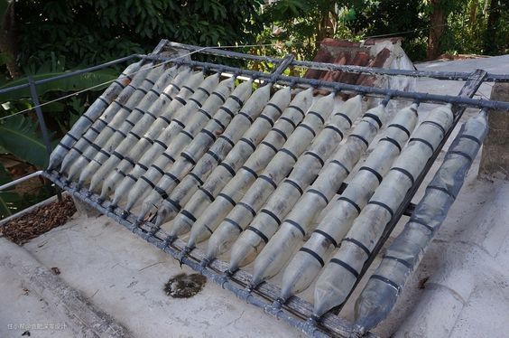上面这图就是用塑料瓶的,里面有水管贯穿着,形成一排排的,从而组成了一个面。水管能够起到供水的作用,将里面灌上水后,就能起到很好的降温作用,和我们一般在楼顶蓄水隔热是一个道理。下面给大家看看这个原理图:
