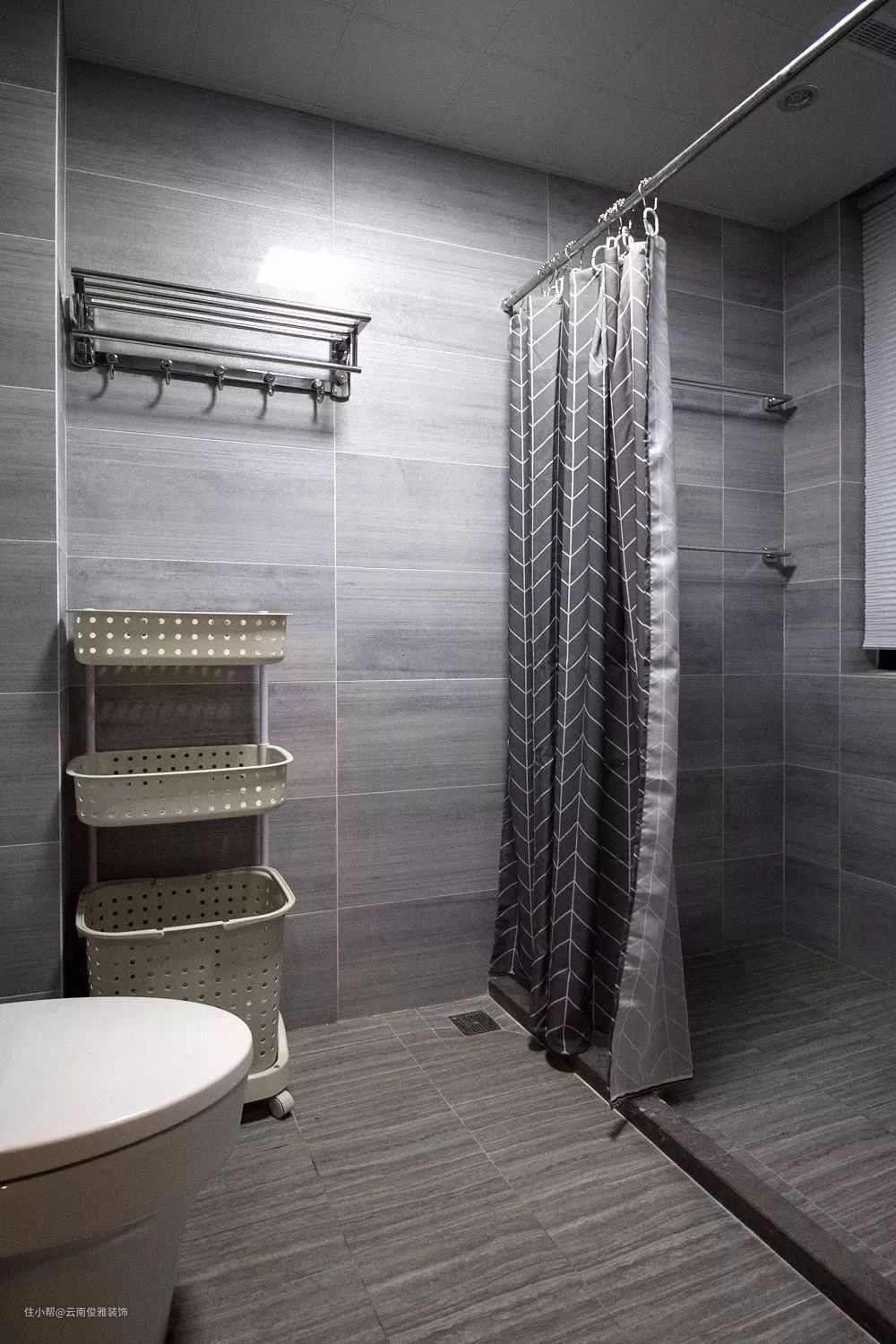 对于一些不喜欢做淋浴房的屋主,你可以考虑用浴帘和挡水条来做个干湿分离,这样的设计比较简便和实惠,但下水要做好一些,避免水漫过挡水条。