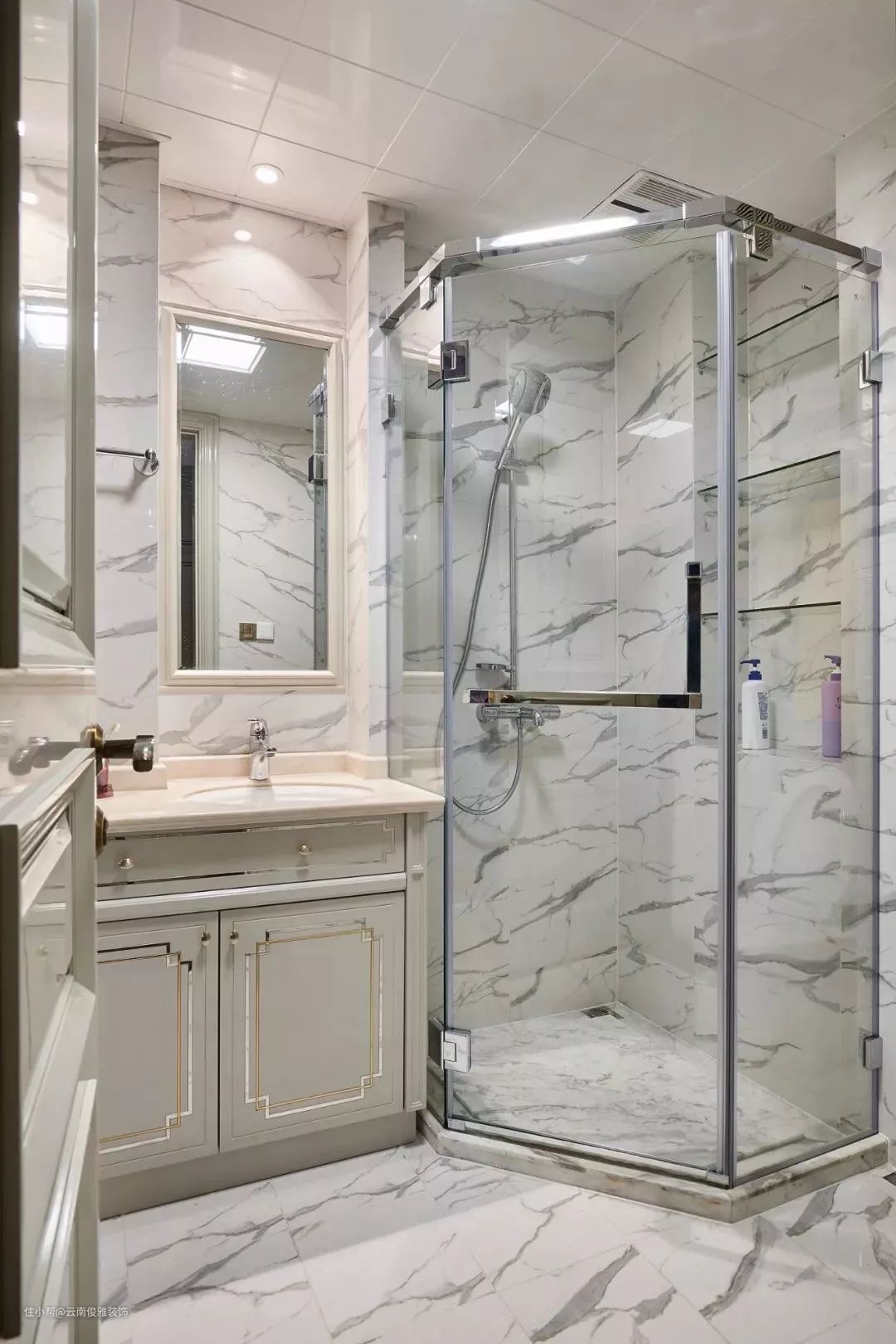 也可以选择做个淋浴房,方型的淋浴房设计在卫生间的角落里,然后马桶和浴室柜放在外面,不用担心水会溅到马桶和浴室柜。