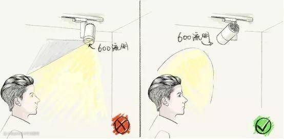 图左灯具垂直照墙,让局部太亮,经过墙壁折射又产生了人眼辉度甚至眩光