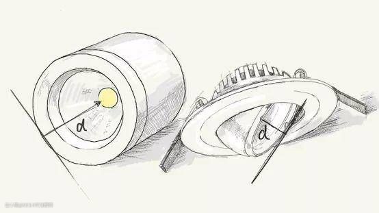 有一种简易方法人眼辨识遮光角,你看产品图片实物感受一下,灯口平面到光源的深度d和拇指长度相似,遮光角就在45度左右,这样的灯具少眩光。