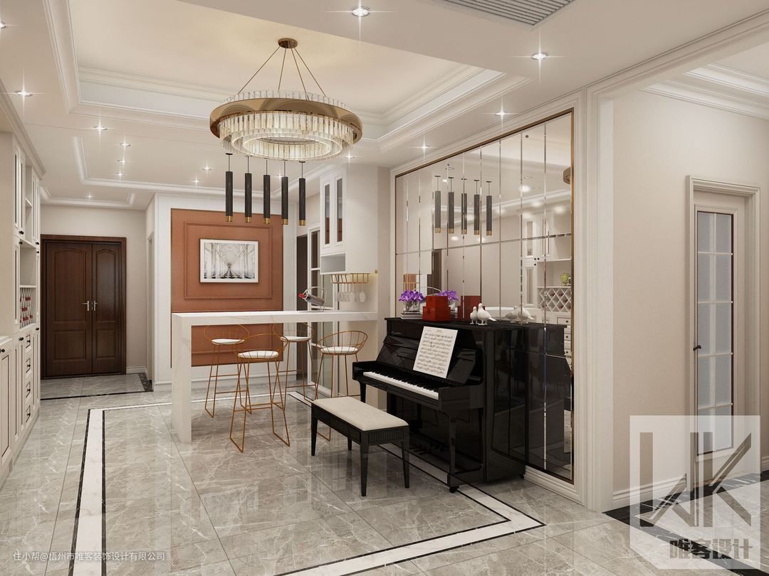 而与客厅相连的是简易的吧台和练琴房,两者之间的色彩搭配、灯光设计等方面都保持着高度的一致,只通过家具的摆放布局作为区分。而由上图的视角看过去,不但可以直接了解整个餐、客厅的全貌,而且与之相连的厨房空间也一并收入眼底,整体的布局上可以说是非常的通透、敞亮了。