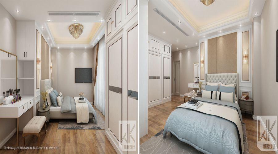 卧室的空间虽不算宽敞,但在地面装饰上,摒弃了餐客厅以及厨房的立体造型地砖,而是采用了脚感更为舒适的木地板进行铺贴,同样搭配上了与客厅同款的腈纶地毯,增加空间的舒适度。而两侧的床头柜则采用了金属面板的设计。