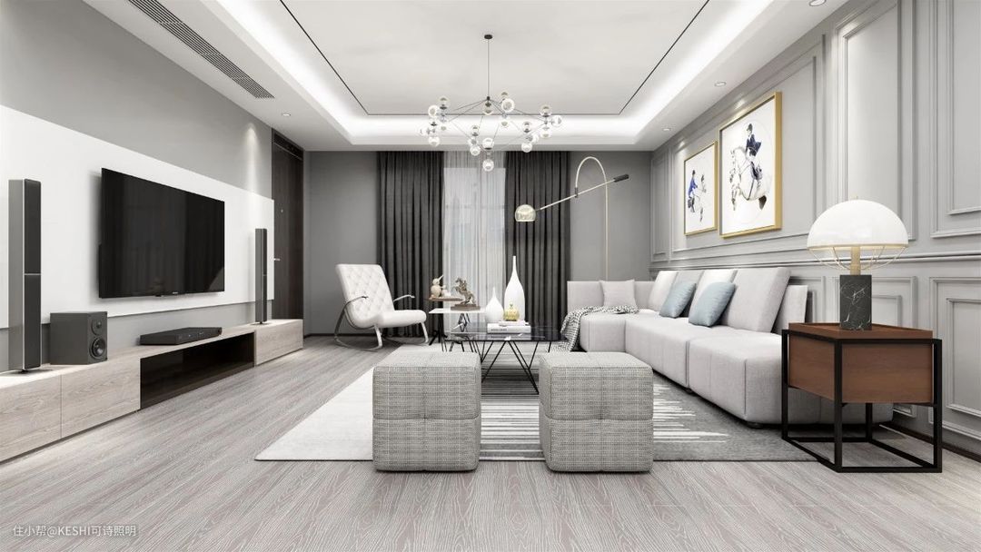 筒灯属于客厅的常用灯,可弥补主灯单一的光源,使空间光线均匀。如果客厅不设主灯,也可利用筒灯与其他辅助灯光搭配以满足照明与装饰的作用。