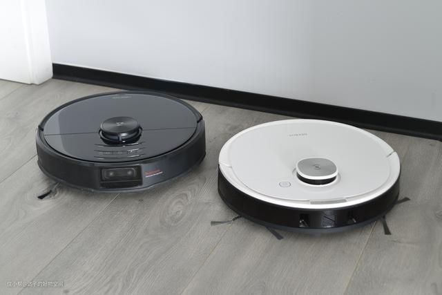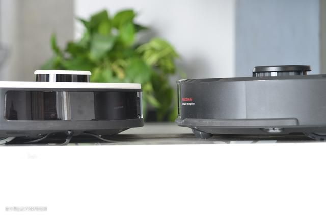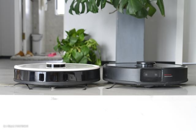 开篇先简单对比一下两台产品的外观。白色的是科沃斯T8 (后称:T8),黑色的是石头T7 Pro(后称:T7 Pro)。一黑一白,也比较好区别。两者在细节上还是会有些区别----T8更加的简洁,3D结构光模块窗口不大。而T7 Pro将一些按钮直接做在了机器的顶面,不能说不好看,但还是觉得有点画蛇添足了。不过T7 Pro的双目摄像头倒是更有科技感。