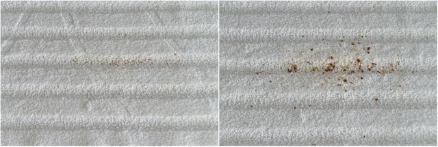 最后两者清理的结果如下图。左侧是T8清扫后的结果而右侧则是T7 Pro清扫的结果。实际的情况是,两者都没有完全的把地毯清扫干净。但差别还是非常明显的,至少T8更干净。