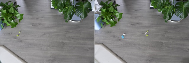 然后让两台机器人分别进行清扫作业。最后的结果如下。左侧是T7 Pro清扫以后的样子,地上只剩下两块积木且偏移原来的位置的距离较远。右侧为T8清扫之后的样子。虽然积木没有全部安全,但保留下来的数量较多,并且有三块积(2绿1白)木几乎没有太大的位移。
