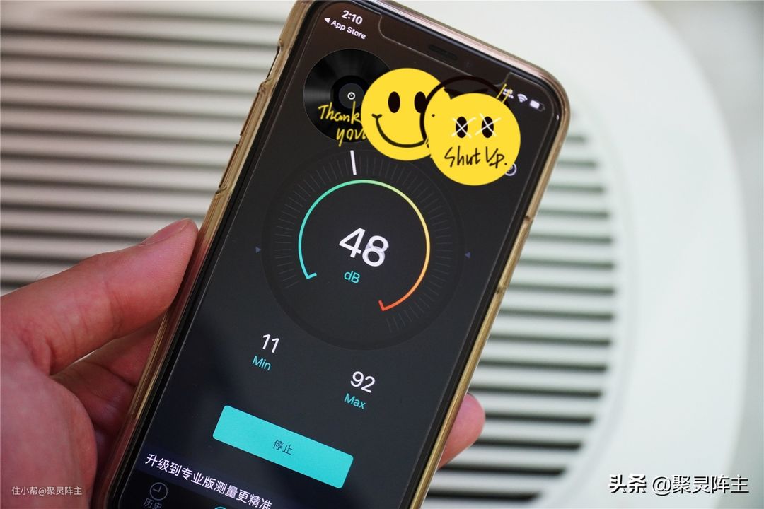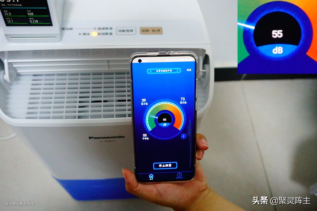 接下来我通过手机上的噪音分贝测试app测试了它的噪音大小。我将手机(你没看错,这就是小米10pro,特别香,我还要写一个它的开箱评测,羡不羡慕)放在除湿机的出风口,也就是离风机最近的地方,可以看到噪音大概55分贝左右,也就相当于空调制冷出风时发出的声音大小,完全不用担心吵人。