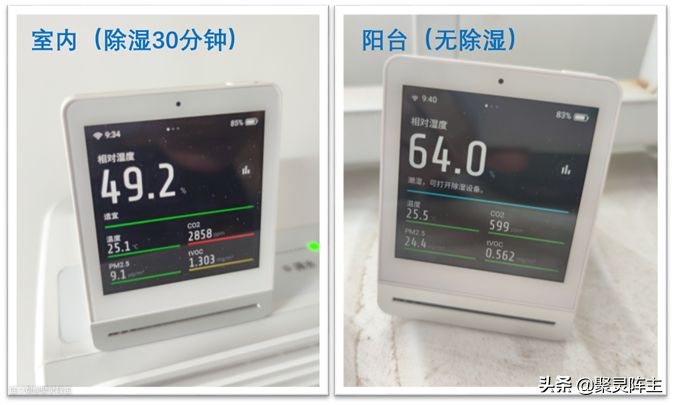 干衣模式开启之后差不多半个小时,我用空气质量仪检测了干衣模式下卧室内的湿度,以及卧室阳台的湿度。具体可看下面的这张对比图,在下了一晚上大雨之后,卧室阳台(请原谅北京阳台无尽的尘土吧)的湿度已经高达64%了,空气质量仪也正在提醒打开除湿设备,而卧室内通过除湿机半个小时的工作,湿度已经降到了49%的正常水准。