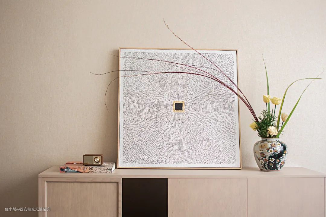 阅读使人闲适,墨香使人静宁。几本日式书籍,充满禅意的几处细枝绿叶,同样散发着温度的宣纸拼贴画,足矣营造出居住者憧憬的生活向往:坐看云起,展卷闲茗,诗意栖居,方寸净明。