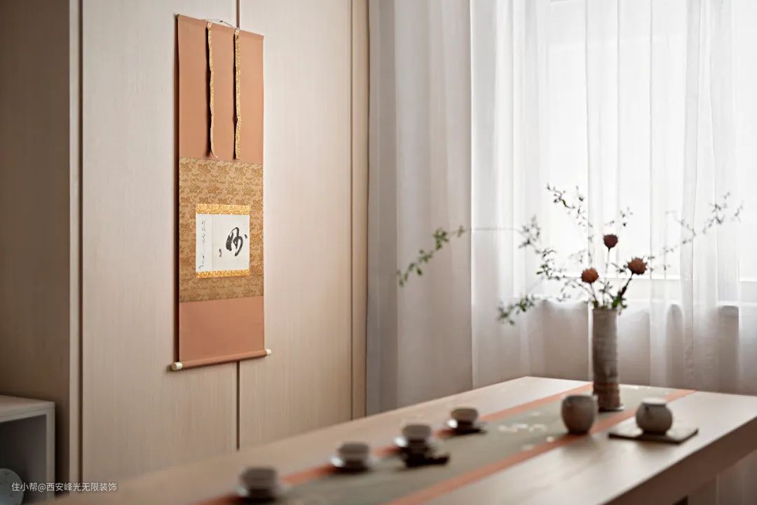 而这也成为本案设计师的色彩灵感来源,日系色谱中的“赤錆色”始终贯穿了整个软装设计的跳色来源,这个源自矿石的颜色,在本案中绽放出秋季一般温暖的色泽,体现出氤氲暖阳下,茶香染年华的禅意生活。