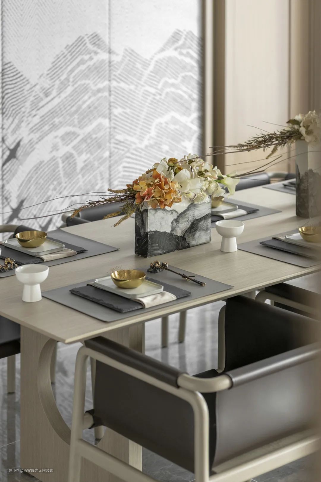 一步入玄关,“江涵秋影雁初飞,与客携壶上翠微”之景在众安宁静一偶静静等待着观者的到来。闭眼仿佛可听长空雁叫,睁眼隐然可观万羽翩跹,虚实相生是造景和装饰画的主色,这是一场空间和时间的对话。