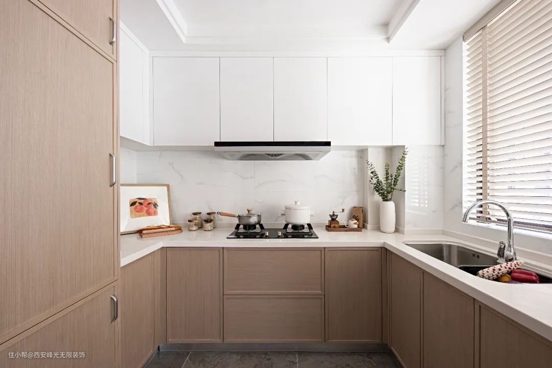厨房以简洁的直线条分割出纯淨质朴的空间感,装饰画和花瓶软化了横平竖直的硬朗,断舍离之后只剩下简单的元素给予自然的感受。