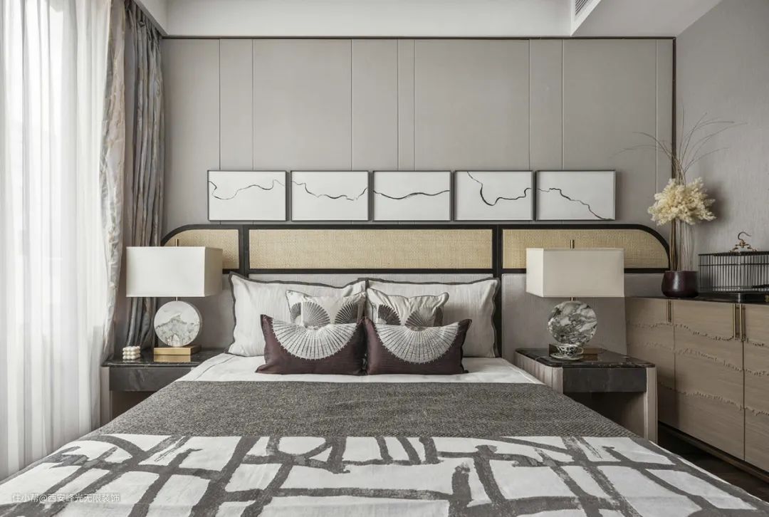 卧室背景以一幅风俗画徐徐展开,浅色木饰面为基调,搭配富有自然肌理感的石材家具,碰撞出富有人文气息且具现代品质感的诗意禅韵。