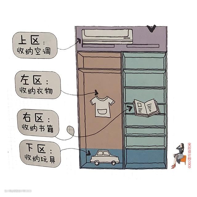 对于这个综合收纳柜,COCO建议将其分为上下左右4个区域,来收纳孩子的核心物品。