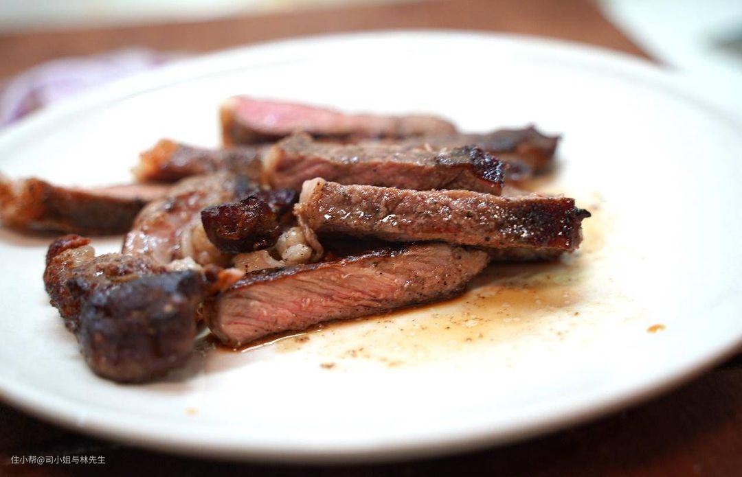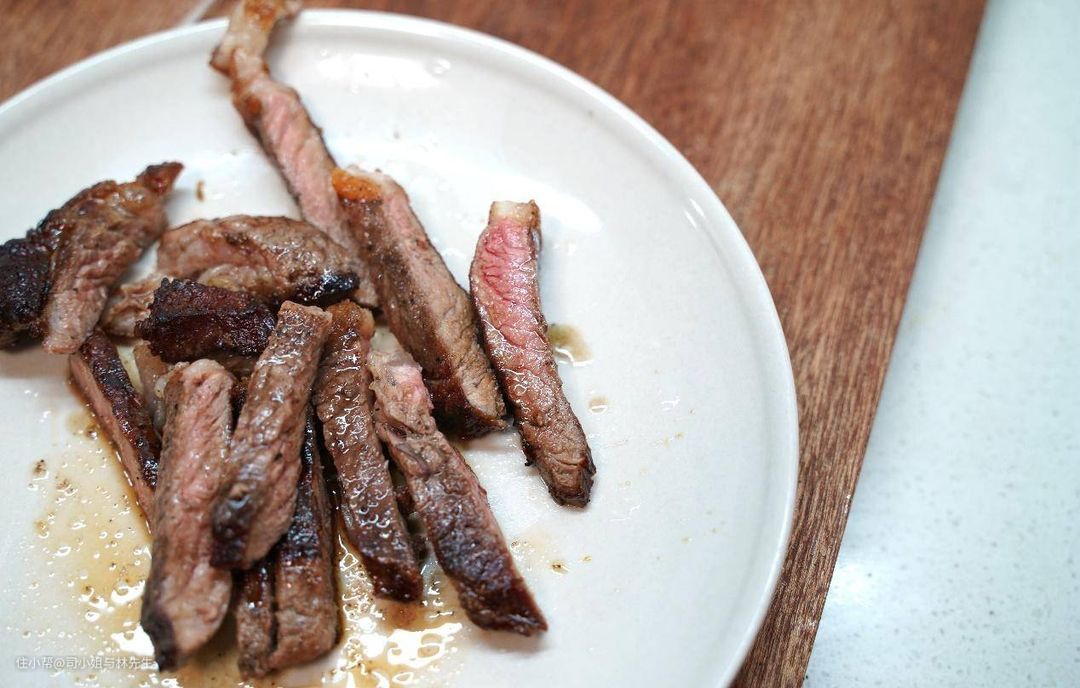 ▲关于煎牛排的火候,我一直是跟着感觉走,我觉得时间差不多就翻面,不够今天翻面的有点晚,焦化层有点太深了,我其实有点慌。感觉这次有点翻车了。
