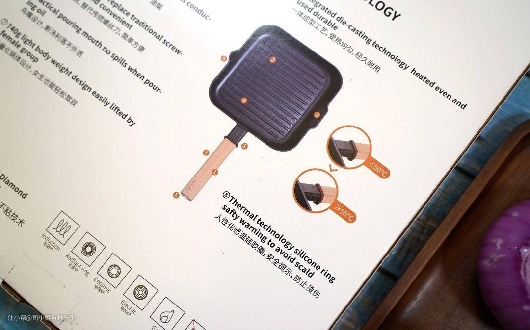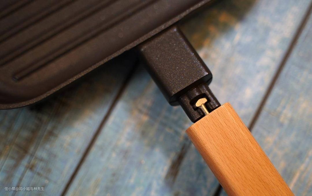 ▲为了防止烫手,牛排锅的手柄处专门设计了人性化的感温胶圈,防止误触烫伤,这种设计现在很流行,很多锅体都有这种的设计。