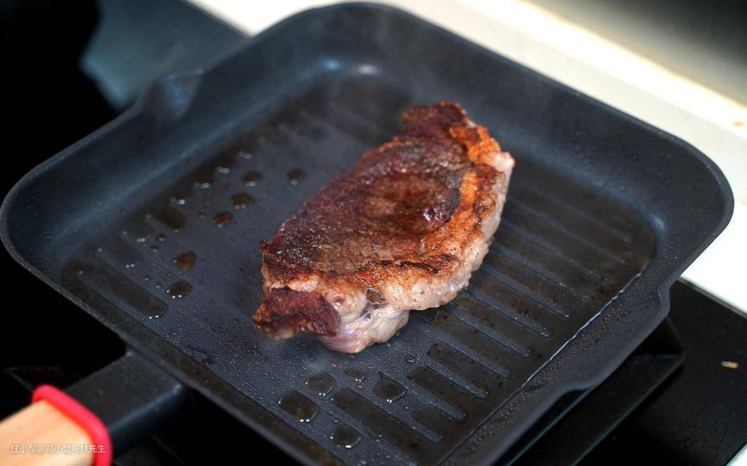 ▲牛排锅底部的纹理是有讲究的,普通的平底煎锅和牛排底部完全接触,导致牛排的表面干燥水分流失,降低入口的口感,而条纹锅底可以将牛排接触面的水质流出,不会焦糊,而且还会有漂亮的纹路。