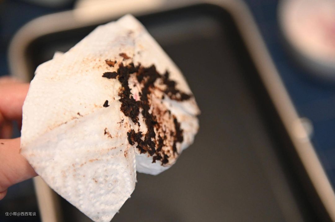 小插曲,肉烤多了总有些残留,家里是没有烤盘更换的,得益于特氟龙的材质,只要用厨房纸巾一擦就可以吸走多余的油和肉渣(一般纸巾也可以就是没这么厚)。