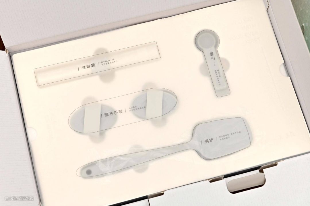 除了收纳架,适盒也在配件中准备了硅胶隔热手套,更换料理盘时温度还是十分高的,大家需要注意安全,硅胶手套可以很好的帮助我们更换料理盘。硅胶锅铲不惧高温,方便各种料理的翻炒等操作。而量勺则可以方便料理时的用料精准,作为理工男,我对于投料的多少是非常讲究的,最好什么都拿秤量一下。