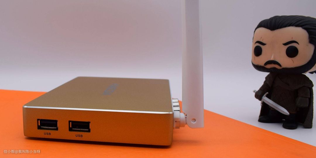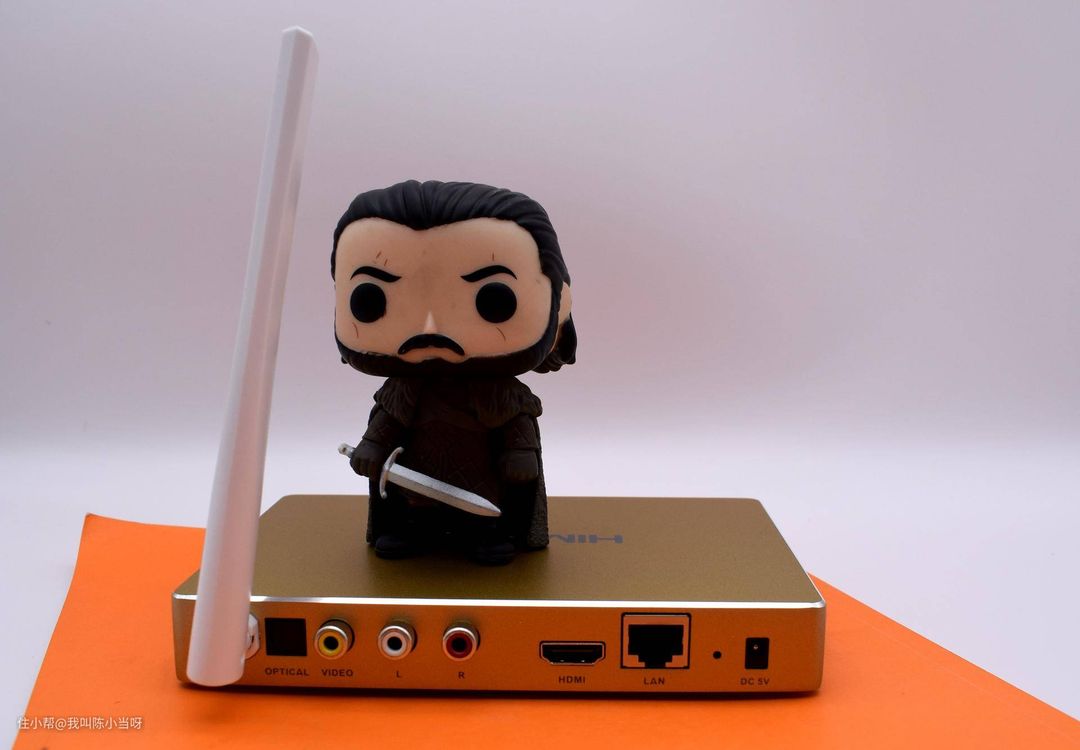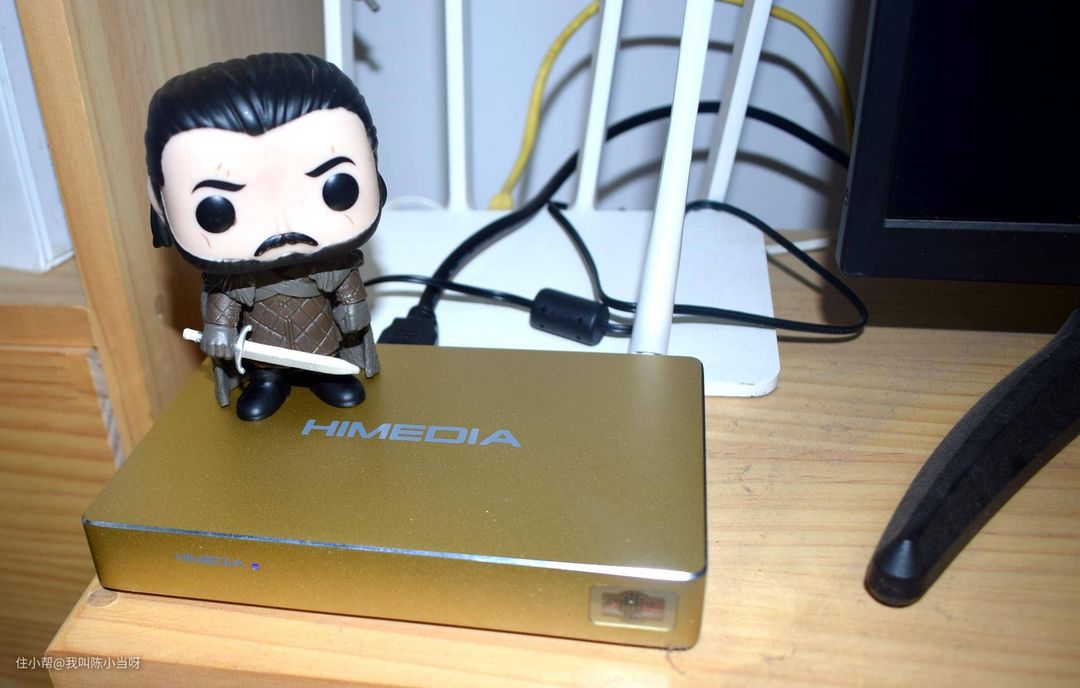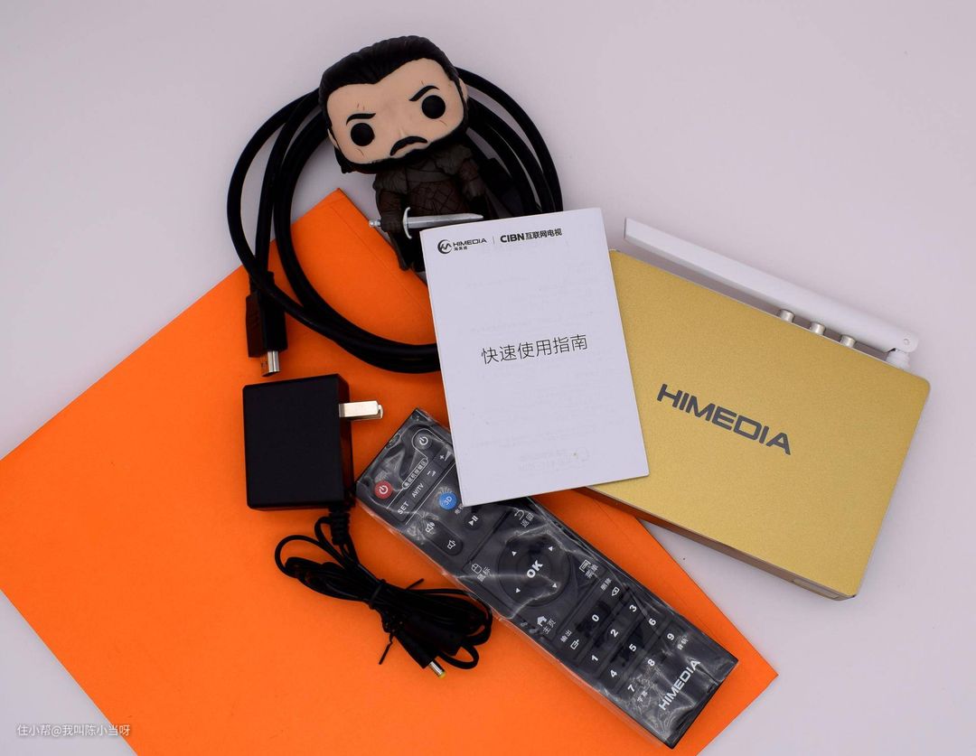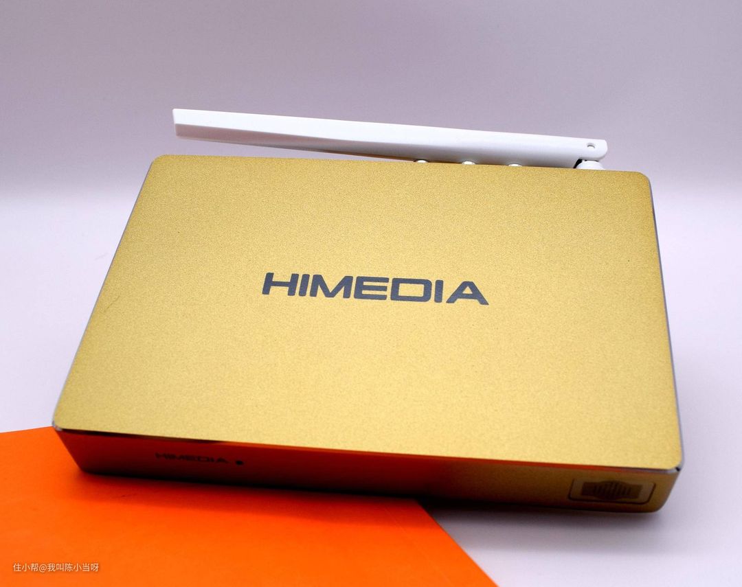 先说机顶盒吧 ,毕竟是核心。外观是一个香槟金色的小方盒还有一根白色的天线,正上方印着HIMEDIA大logo。机顶盒六面外壳是金属材质,这样有利于更好的散热,毕竟内部配置是海思4K芯片,2GB内存+16GB存储,使用时温度不会低,全面的金属包裹可以保证快速散热,使设备稳定的运行。外壳采用了喷砂工艺,说实话,香槟金色我有点欣赏不来,不过机顶盒也算是幕后工作者,出场率不高,这个颜色就不说了。